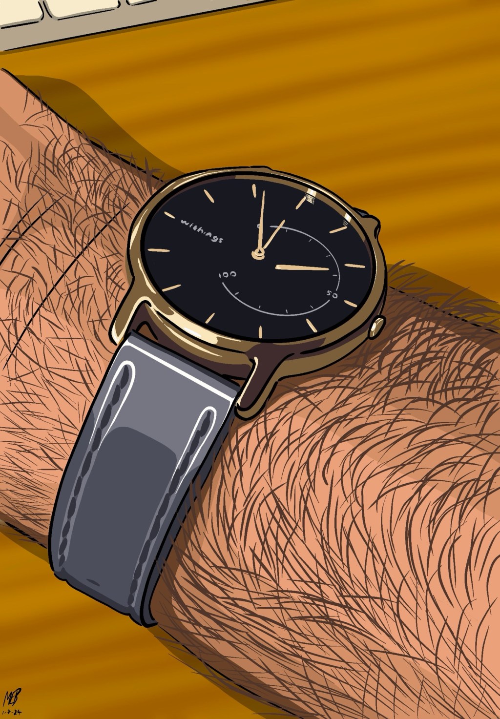 This was an interesting exercise in drawing shiny things (watch) and hairy things (wrist). Given that the drawing app allows you several goes at getting something right if necessary, I have iterated to a version of the drawing that looks okay, and hopefully learnt something about appropriate technique on the way.