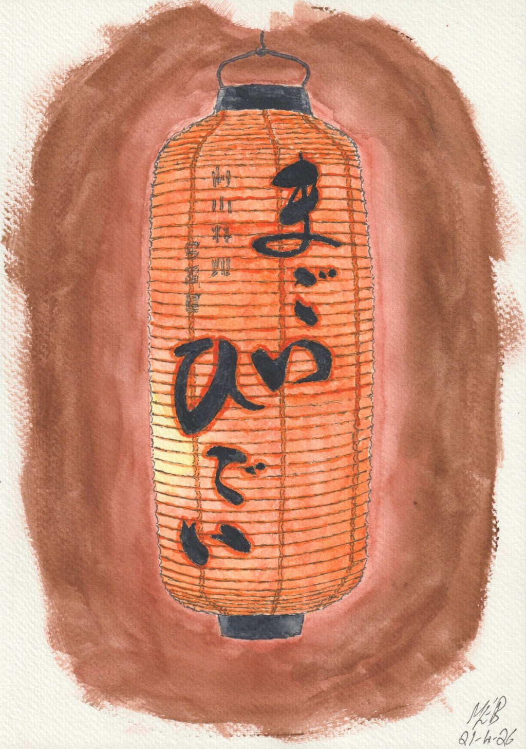 These lanterns hang outside many Japanese restaurants and izakaya (居酒屋) – a term often translated as “Japanese pub”. It took a little while for me to realise that these lanterns promised some kind of refreshment close by, but once the penny had dropped they were very useful when looking for something to eat or drink. So rather like the old English pub signs, they are designed to guide the thirsty in the right direction!